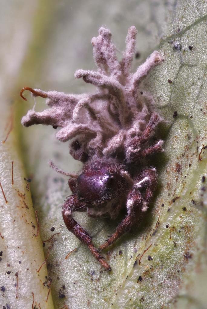 Dothideomycetes Fewer groups are more understudied than this class, so expect to find many more than these. Apiosporina cf morbosa ENA - black knot of cherry. We need local collections. Comoclathris lini EU - black, carbonaceous pustules on twigs, found in WA, matching the type sequence very closely, and also near the type sequence of C. rosae EU. Venturia cf inaequalis EU - apple scab disease. We need local collections. Leptopeltis sp. - class actually unknown. These are tiny, stemless cups growing on fern debris and salal that start out translucent and end up "chamois" (pale yellow and leathery). Leptopeltis aquilina EU (=Leptopeltis pteridis EU?) has been reported from the PNW, supposedly in this class, but this is doubtful. Leptopeltis litigiosa may likely be in the Leotiomycetes. The type species of the genus, Leptopeltis filicina, is thought to be in neither class. This means this fungus likely needs a new name and to be placed in the proper class. We need local collections. Glyphium PNW01 - black carbonaceous cylinders on wood. It has also been found as small resupinate black or white discs with a black rim, which could be an asexual state (or they were just broken?). We have one OR collection. EU sequences of Glyphium elatum UK may differ from each other by a couple % in ITS2, but our OR collection is different in both ITS1 and ITS2 by a couple percent, so I'm using a provisional code for it. It also appears to be close to Glyphium grisonense EU. Seifertia azalae NY - grey fuzzy balls with black stems growing from Rhododendron and Azalea. Not known from the PNW until sequenced from WA. This is the type species of the genus, which seems to have good support for being in this class, and our sequence matches EU sequences and what may be ENA type area sequences. Cladosporium sp. 'PNW01' - black carbonaceous lumps on a Laetiporus polypore. This matches sequences with different names, including the type of the genus, Cladosporium herbarum EU, fairly well except for one section of ITS. It probably has a name but it is unclear to me what that is. Acrodontium crateriforme EU - a parasite on a parasite, growing on the Gibellula (Sordariomcyetes) mold on an insect. Comoclathris lini © Matthew Koons, unsequenced Venturia inaequalis © Michael Beug, Glyphium PNW01 © Roo Vandergrift (2 images) and iNaturalist user suebel (asexual form?) Seifertia azalae © Matthew Koons (2 images), Cladosporium sp. 'PNW01' © Matthew Koons, Acrodontium crateriforme © Richard Tehan |