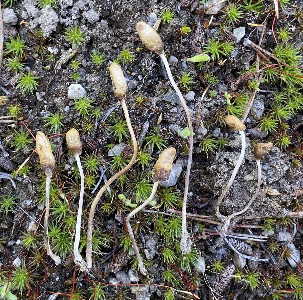 'Galeropsis' 'polytrichoides CA02' - a secotioid Psilocybe found in Polytrichum moss. There are 2 sister species about 6 bp apart from each other in ITS, and we don't know which is the real CA species until we get a type sequence. 'Galeropsis' 'polytrichoides CA02' © Ed Barge