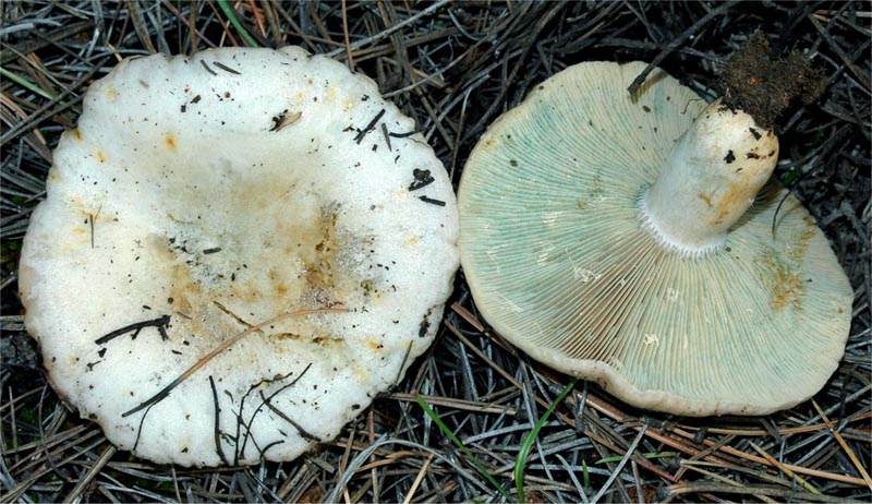 This rare mushroom is very pale, almost white, but may have orange and green splotches. Its milk is red. It has been found in either Washington or Idaho (the report is conflicting), but is more common in the SW (Arizona, Colorado) under pine. It is probably an inland species.
