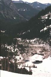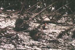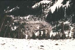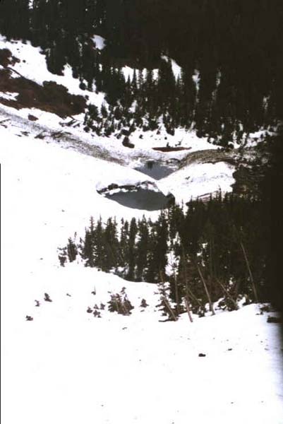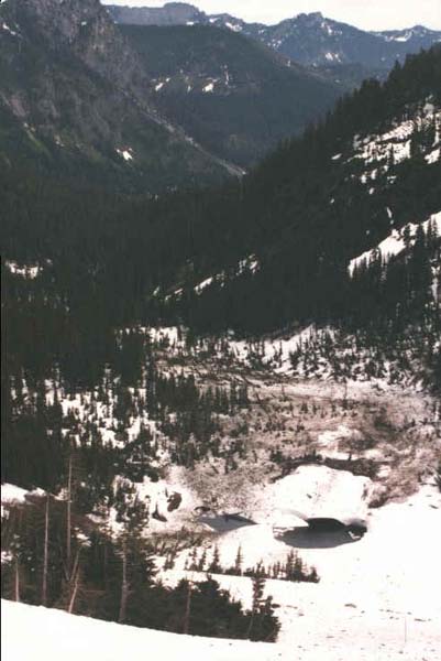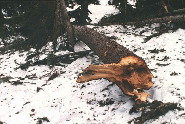 Destroyed forest below Source Lake. Note the snow level at the time by