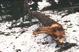 A close-up of a tree that was snapped like a twig by the avalanche.
