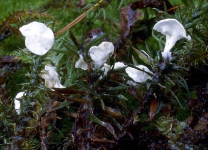 Basidiomycota - there are just a few cup-shaped fungi that are not Ascomycota, but Basidiomycota. You would never know this unless you examine them under a microscope or recognize them from these pictures. Not only are they Basidiomycota, but they are closely related to the gilled mushrooms! Over the years they may have lost their gills kind of like you stopped using your appendix. They are rarely found, possibly because of their minuscule size and confusion with the small cup-like Ascomycota found on the rest of this page. They are found growing saprophytic on moss. Most might fruit year round. <1cm. They are also found on the Oddball page of gilled mushrooms.