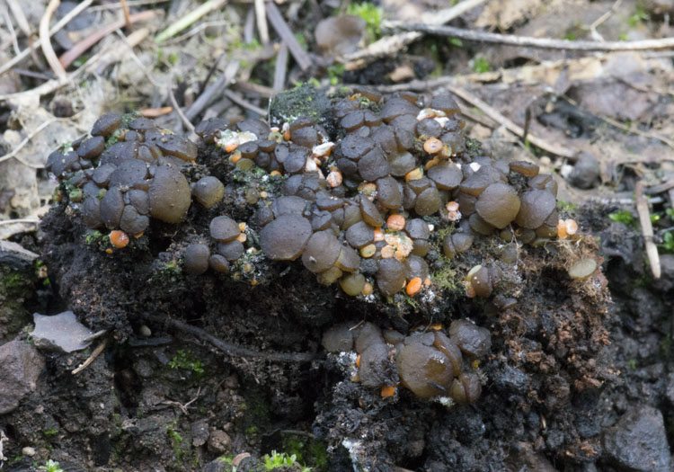 Byssonectria fusispora - <5mm yellow-orange mass of discs that do not fuse, scanty mycelial mat. Compare B. cartilaginea.