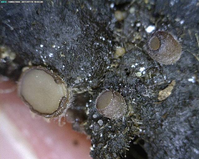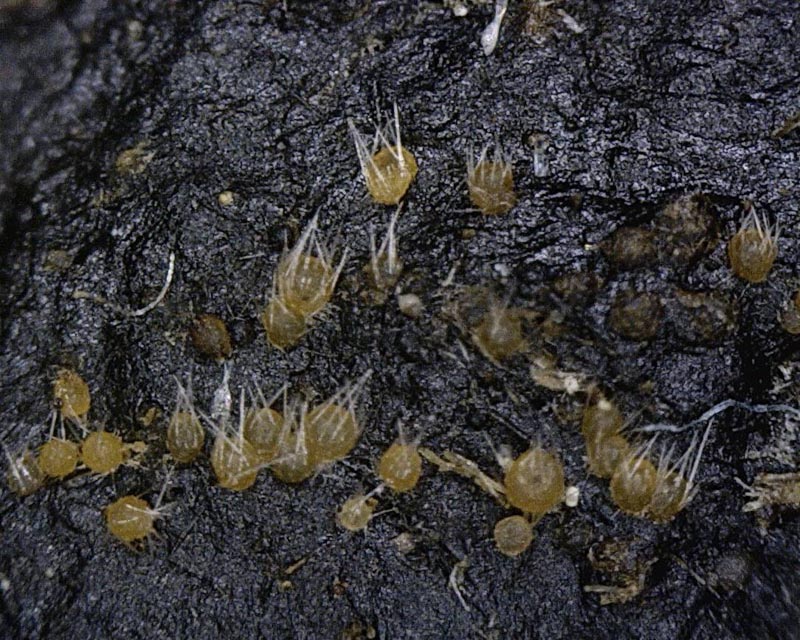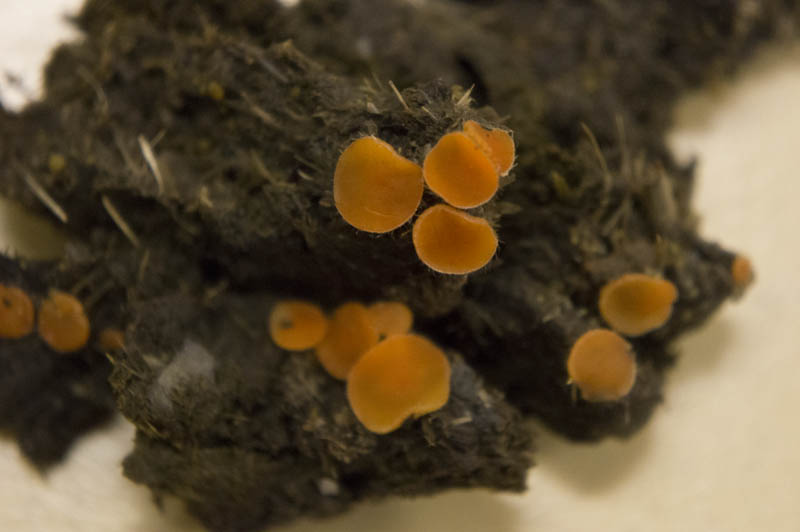 Thelebolus stercoreus - found on dung, <0.25mm, smooth, yellow-brown with a single protruding ascus with >1,000 spores.