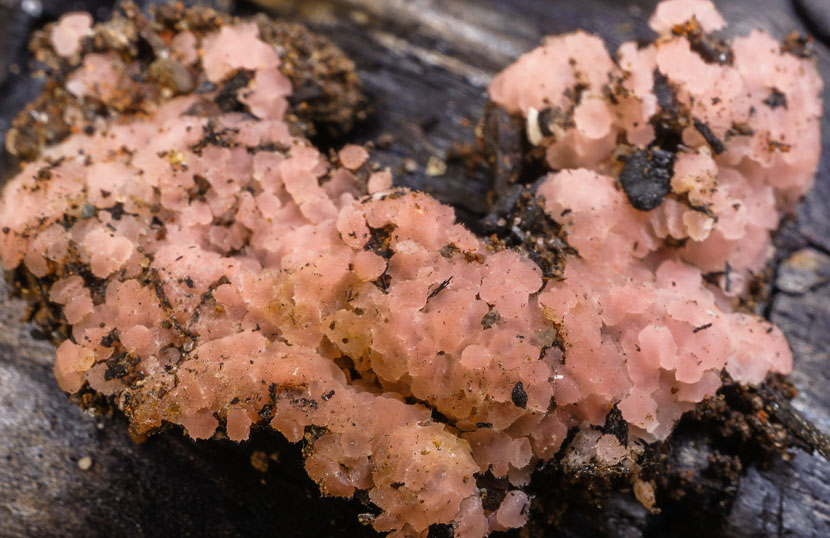 Iodophanus carneus - <1mm pinkish, hairy knobs, sometimes on cloth. Asci turn blue in iodine like Peziza.