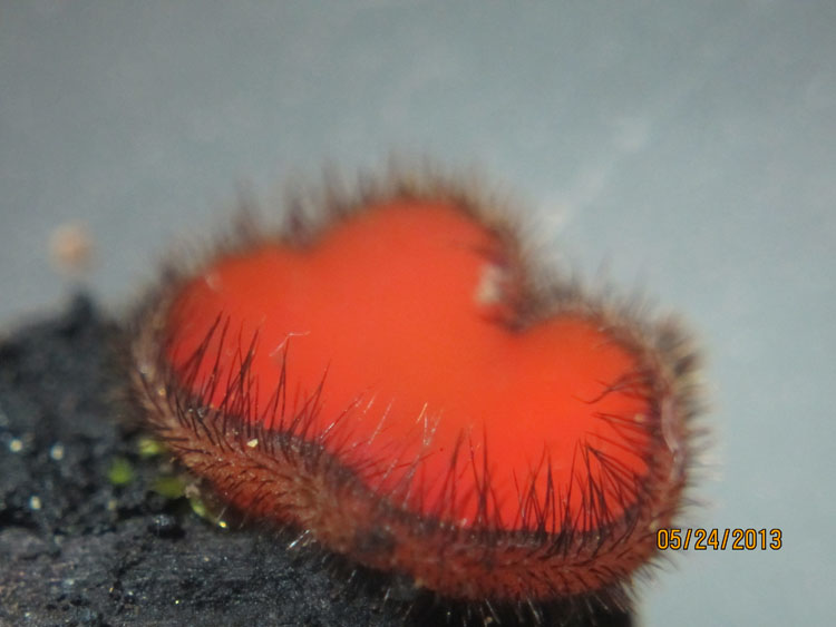 Scutellinia umbrarum - <2cm, orange-red cups or discs with eyelash hairs on rim, occasionally on wood.