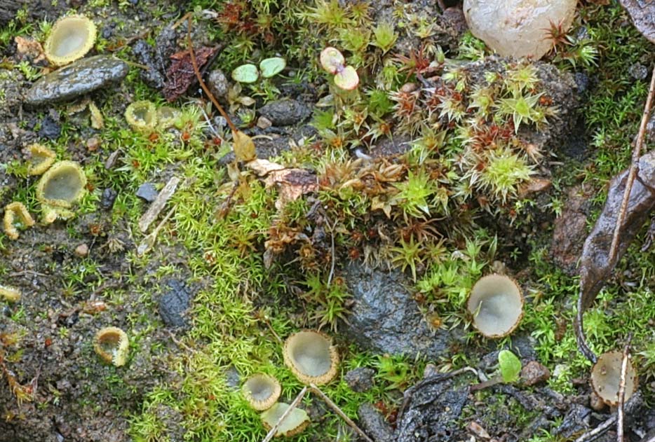 Neottiella hetieri - <2mm, underside with tiny downy hairs, orangish cups to discs on moss covered old burns.