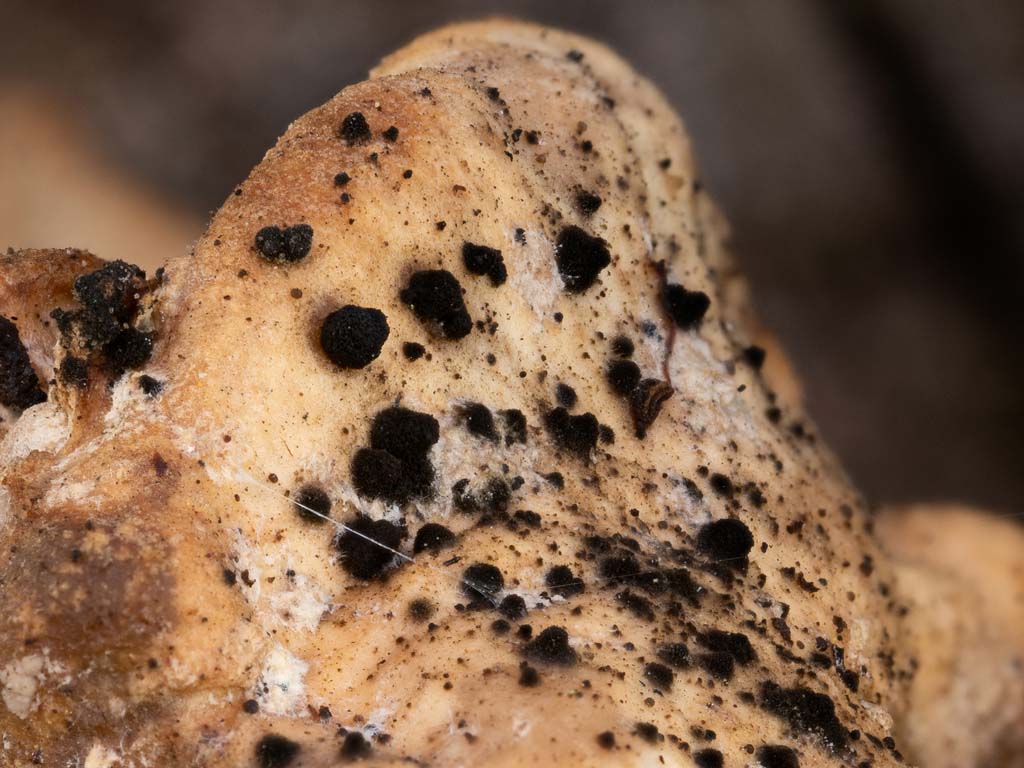 Dothideomycetes Fewer groups are more understudied than this class, so expect to find many more than these. Apiosporina cf morbosa ENA - black knot of cherry. We need local collections. Comoclathris lini EU - black, carbonaceous pustules on twigs, found in WA, matching the type sequence very closely, and also near the type sequence of C. rosae EU. Venturia cf inaequalis EU - apple scab disease. We need local collections. Leptopeltis sp. - class actually unknown. These are tiny, stemless cups growing on fern debris and salal that start out translucent and end up "chamois" (pale yellow and leathery). Leptopeltis aquilina EU (=Leptopeltis pteridis EU?) has been reported from the PNW, supposedly in this class, but this is doubtful. Leptopeltis litigiosa may likely be in the Leotiomycetes. The type species of the genus, Leptopeltis filicina, is thought to be in neither class. This means this fungus likely needs a new name and to be placed in the proper class. We need local collections. Glyphium PNW01 - black carbonaceous cylinders on wood. It has also been found as small resupinate black or white discs with a black rim, which could be an asexual state (or they were just broken?). We have one OR collection. EU sequences of Glyphium elatum UK may differ from each other by a couple % in ITS2, but our OR collection is different in both ITS1 and ITS2 by a couple percent, so I'm using a provisional code for it. It also appears to be close to Glyphium grisonense EU. Seifertia azalae NY - grey fuzzy balls with black stems growing from Rhododendron and Azalea. Not known from the PNW until sequenced from WA. This is the type species of the genus, which seems to have good support for being in this class, and our sequence matches EU sequences and what may be ENA type area sequences. Cladosporium sp. 'PNW01' - black carbonaceous lumps on a Laetiporus polypore. This matches sequences with different names, including the type of the genus, Cladosporium herbarum EU, fairly well except for one section of ITS. It probably has a name but it is unclear to me what that is. Acrodontium crateriforme EU - a parasite on a parasite, growing on the Gibellula (Sordariomcyetes) mold on an insect. Comoclathris lini © Matthew Koons, unsequenced Venturia inaequalis © Michael Beug, Glyphium PNW01 © Roo Vandergrift (2 images) and iNaturalist user suebel (asexual form?) Seifertia azalae © Matthew Koons (2 images), Cladosporium sp. 'PNW01' © Matthew Koons, Acrodontium crateriforme © Richard Tehan |