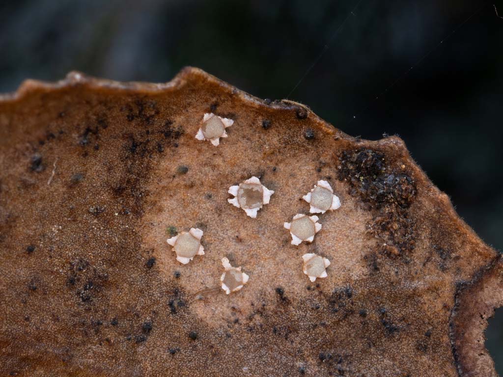 Phacidium lacerum EU - one WA sequence of erumpent black cups with a white stellate margin on holly leaves matches the epitype sequence of this, the type species of the genus and order. This genus was not known from the PNW until this was sequenced. Phacidium lacerum © Matthew Koons (2 images) |